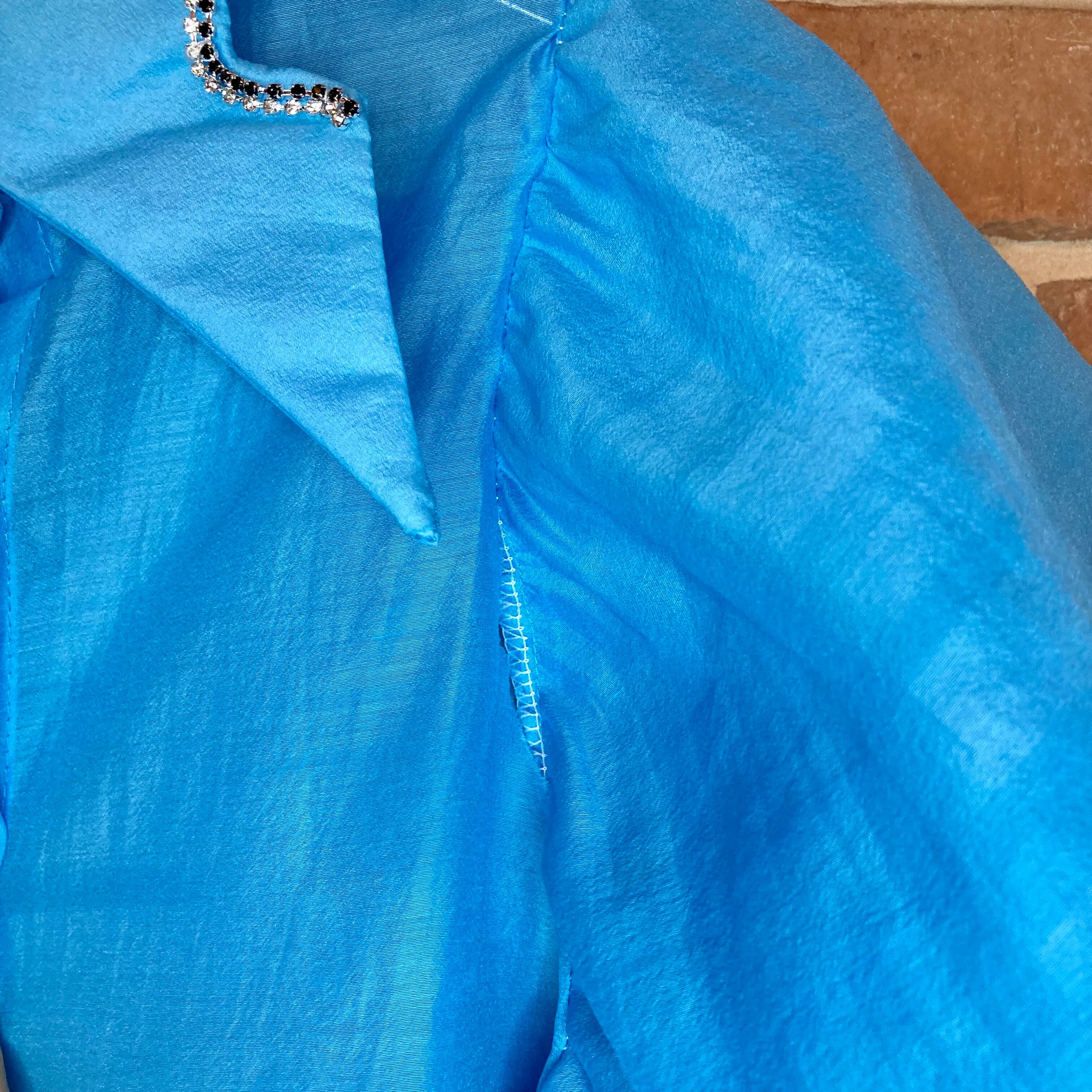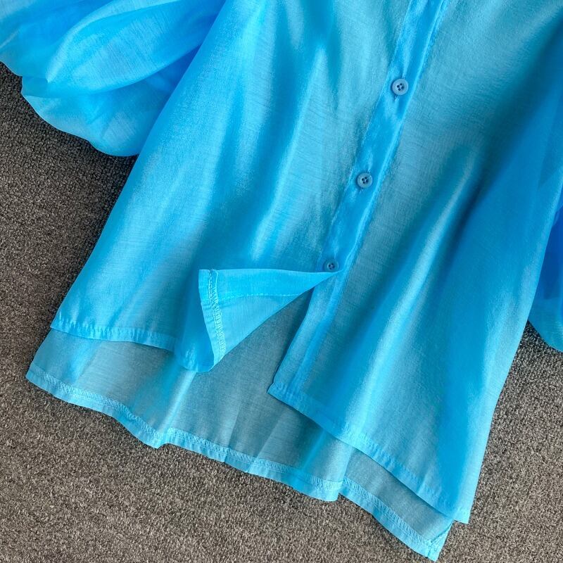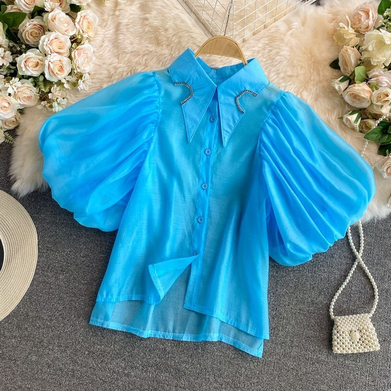 〈訳ありアウトレット〉送料無料 ◆D588 襟付き ツヤ シアー パフスリーブ 前開き ドレスシャツ ブラウス《 ブルー 》カラーシャツ 襟付きブラウス ラインストーン 無地 水色 黄緑 パワースリーブ パワーショルダー バルーンスリーブ ランタンスリーブ ライム グリーン マゼンタ ターコイズブルー シルバー 半袖 インポート パーティードレス ビタミンカラー キャンディーカラー メール便 袖あり カジュアル トップス カラーシャツ B品 訳あり 訳あり品