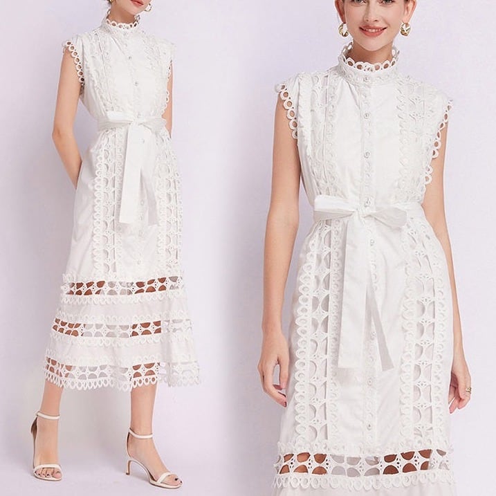 送料無料 ◆ D1966 リボン付き スタンドネック パールボタン レース ノースリーブ ドレス ワンピース《ホワイト 》 白ワンピース ホワイト 白 白ワンピ クラシカル インポートワンピース ノースリーブ 膝丈 インポートワンピース メール便 裏地あり 透けない 上品 エレガント マキシ ロング パーティー 衣装 ワンピ インポートドレス