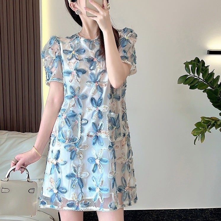送料無料 ◆ D1983 フラワー リボン刺繍 パール スパンコール 半袖 ミニ ワンピース《ホワイト×ブルー》白 青 ブルードレス ミニドレス ミニワンピ ミニワンピース ミニ丈 花刺繍 光沢 インポート パーティードレス お出かけ メール便 パーティーコーデ お呼ばれ 袖あり インポートワンピース カジュアル 衣装 発表会 結婚式 謝恩会 同窓会 パーティー