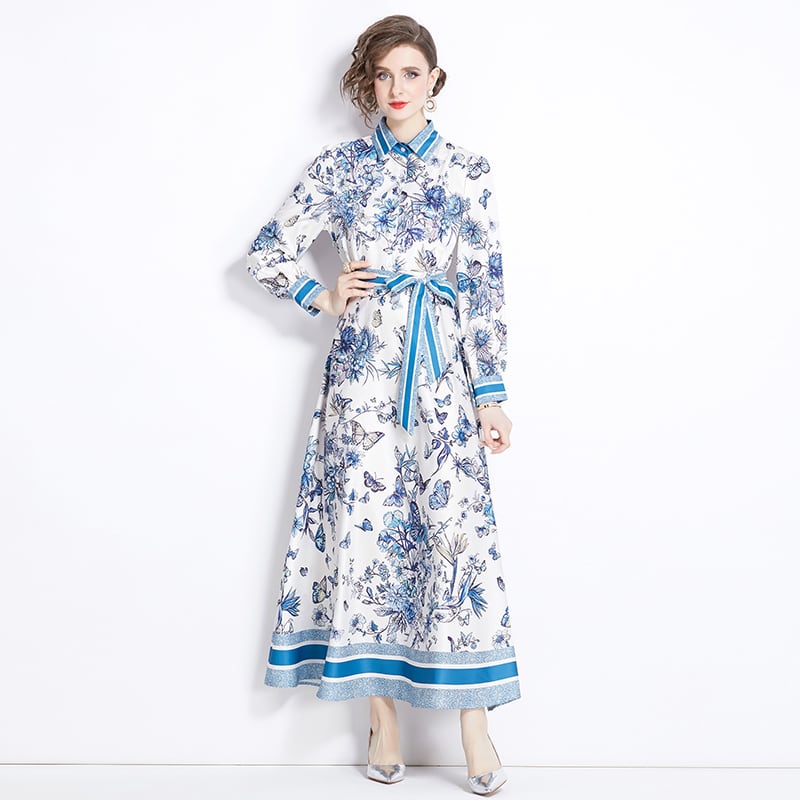 送料無料 ◆ D1989 リボン付き 襟付き ブルーライン フロントボタン バタフライ ボタニカル ロング ワンピース 《 ホワイト×ブルー》 ロング マキシワンピース フラワー モノトーン シャツワンピース シャツワンピ ミモレ 昆虫柄 膝下 アンクル丈 柄ワンピース クラシカル パーティードレス お呼ばれ 柄物ワンピース 柄ワンピ メール便 パーティーワンピ 袖付き お呼ばれワンピース ロング 衣装 インポートワンピース お呼ばれ お出かけ 同窓会 謝恩会 発表会