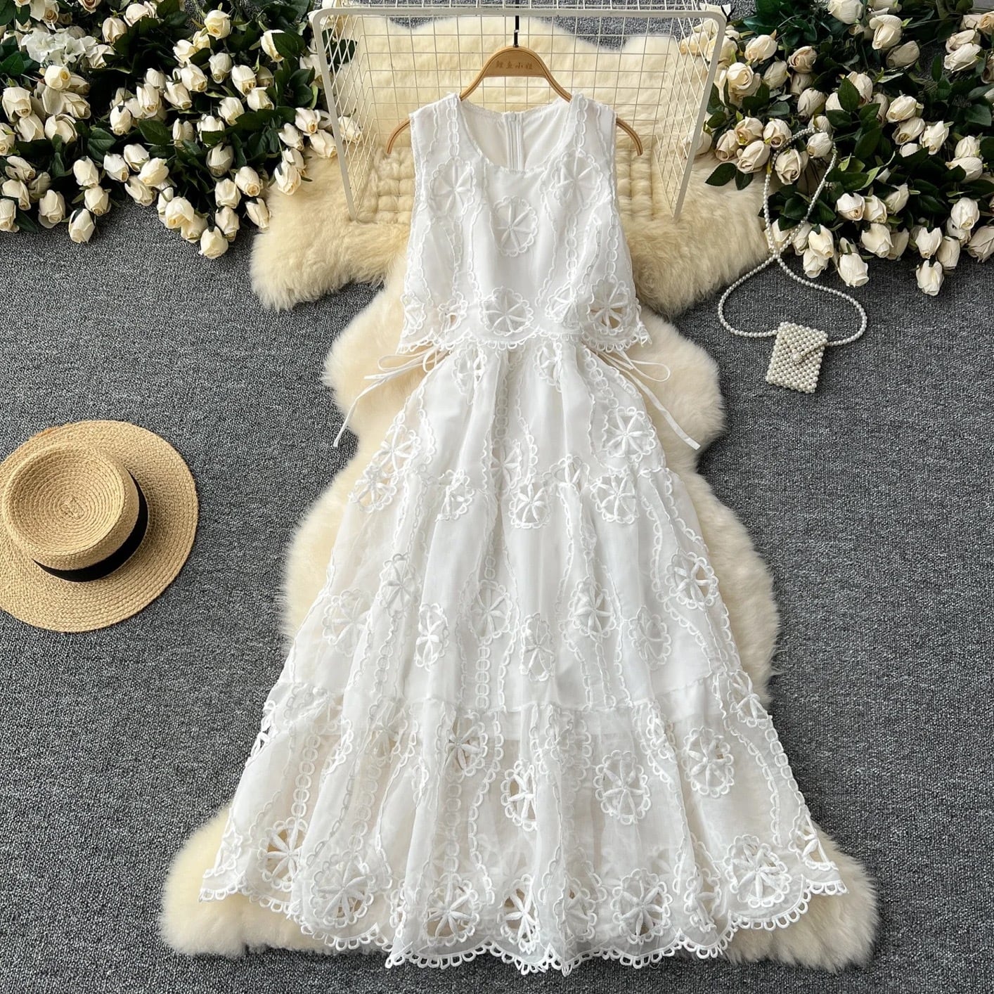 送料無料 ◆ D1992-2 サイドウエストリボン カットアウト ノースリーブ レース ロング ワンピース《ホワイト 》 白 ホワイトワンピース 白ワンピ クラシカル インポートワンピース ノースリーブ 膝丈 インポートワンピース メール便 裏地あり 上品 エレガント マキシ ロング パーティー 衣装 ワンピ インポートドレス