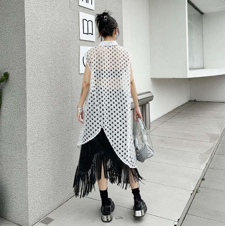 送料無料 ◆ D1865-3 アシンメトリー 襟付き サークル メッシュ ロング シャツ ブラウス《 ホワイト 》 半袖 シャツワンピース ロングカフス ドルマンスリーブ パワショル 太ベルト 衣装 80s 韓国 カジュアルコーデ おしゃれ ファッション モード モード系 緑ワンピース 白ワンピ