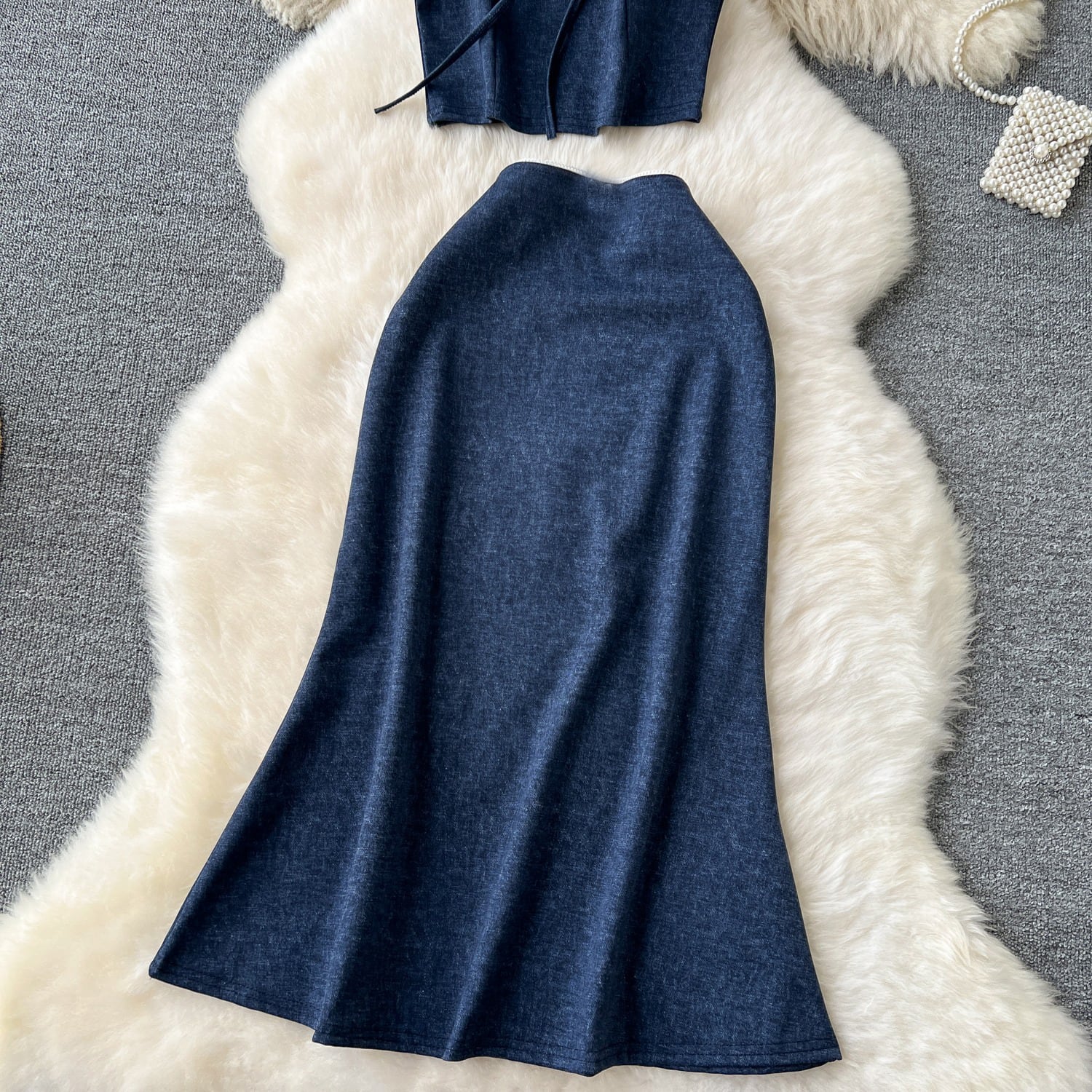 SALE 送料無料 ◆ D1991-2 ノースリーブ リボン トップス & マーメイド スカート セットアップ《 ネイビーデニム 》2点セット 上下セット ツーピース 2ピース ノースリーブブラウス ノースリーブトップス 青セットアップ トップス クラシカル スーツ パーティードレス メール便 カジュアル おしゃれ インポートワンピース お出かけ 衣装 カジュアルコーデ クラシック お食事 オフィスカジュアル カジュアル XSサイズ Sサイズ プチサイズ スモールサイズ