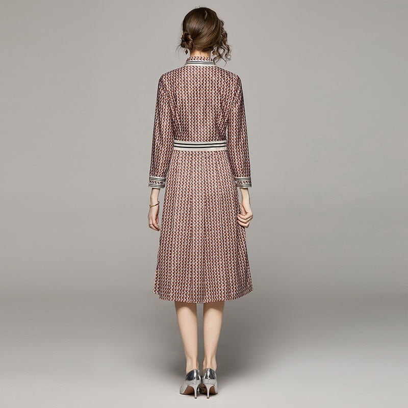 送料無料 ◆ D2018 襟付き ブラックライン ジオメトリック 長袖 クラシカル ワンピース《 ブラウン×ベージュ》 長袖 幾何学柄 柄物 レトロ 膝丈 膝下 ミモレ ミディ 袖ありシャツワンピース オフィスカジュアル おでかけ お食事 セミフォーマル エレガント クラシカル 衣装 上品 華やか メール便