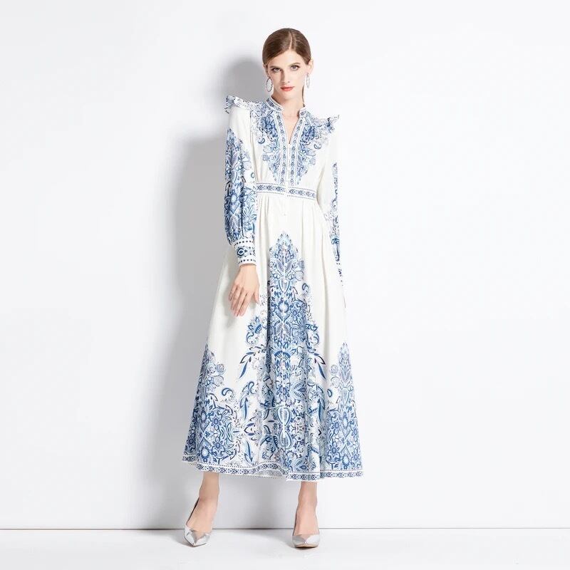 送料無料 ◆ D2027 アラベスク柄 Vネック 長袖 ロング ワンピース《 ホワイト×ブルー 》アラベスク 水色 ライトブルー ブルー 青 ロングスリーブ ワンピース マキシ丈 白ワンピース お出かけ 清楚 上品 インポートワンピース パーティードレス 衣装 柄ワンピース 柄物 パーティー 華やか エレガント メール便
