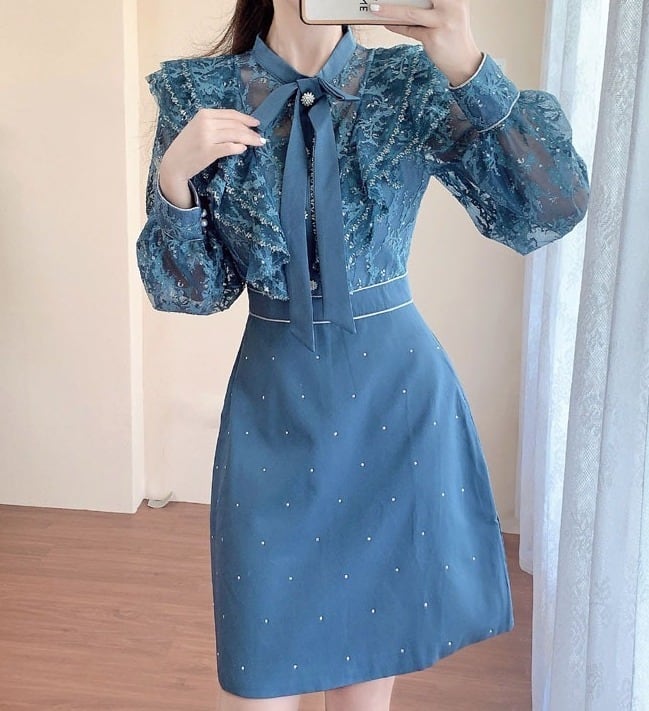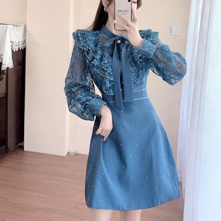 送料無料 ◆ D2029 ボウタイ ビジュー レース 切替 ラインストーン ミニ ワンピース《ブルーグレー×シルバー》水色 ベビーブルー 袖 ブラックドレス ミニ ミニドレス キラキラ 白レース襟 カラフルツイード 光沢 インポート パーティードレス お出かけ メール便 黒ワンピース パーティーコーデ お呼ばれ 袖あり インポートワンピース 黒ドレス 衣装 発表会 結婚式 謝恩会 同窓会 クリスマス パーティー