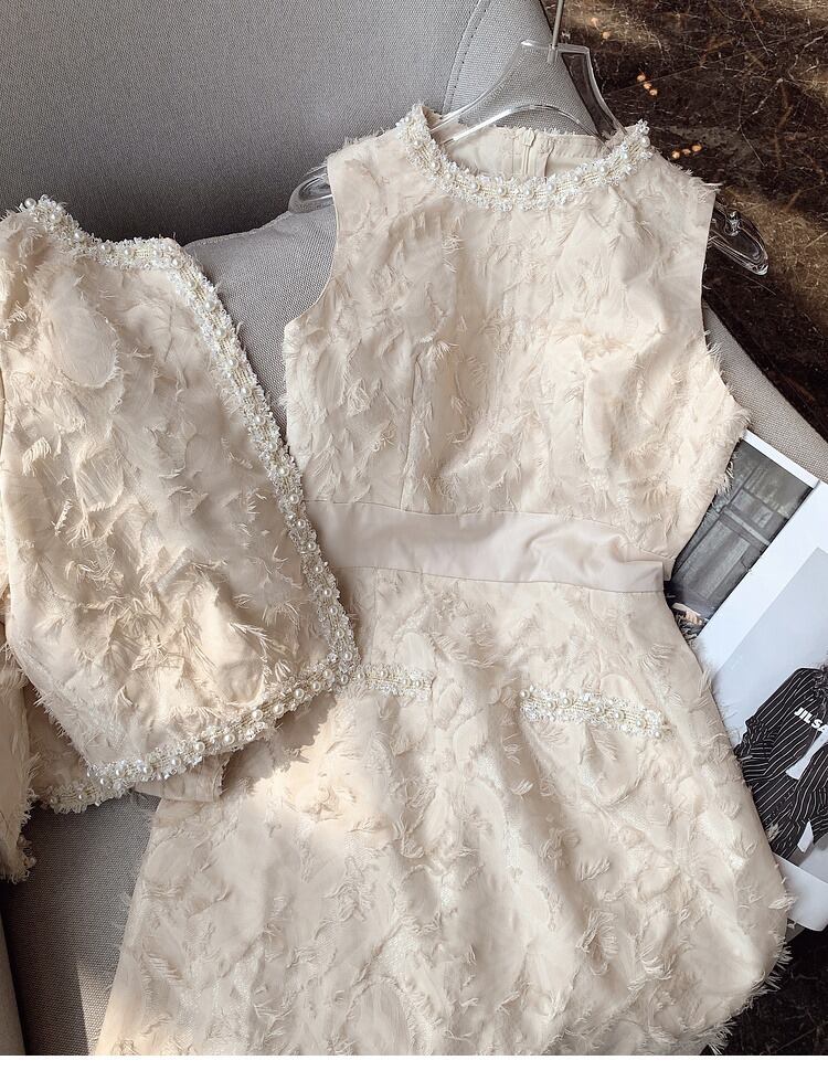 送料無料 ◆ D2036 パール ゴールドライン 起毛 ジャカード 長袖 ノーカラー ジャケット & ノースリーブ ミニ ワンピース セットアップ 《 オフホワイト 》上下セット ツーピース 2点セット セット コーデセット 上下 スーツ ノースリーブワンピ ワンピーススーツ 長袖ジャケット アウター トップス フリル ワンピース パーティードレス 2点 お呼ばれワンピース パーティーコーデ おしゃれ インポートセットアップ 衣装 セミフォーマル フォーマル オケージョン