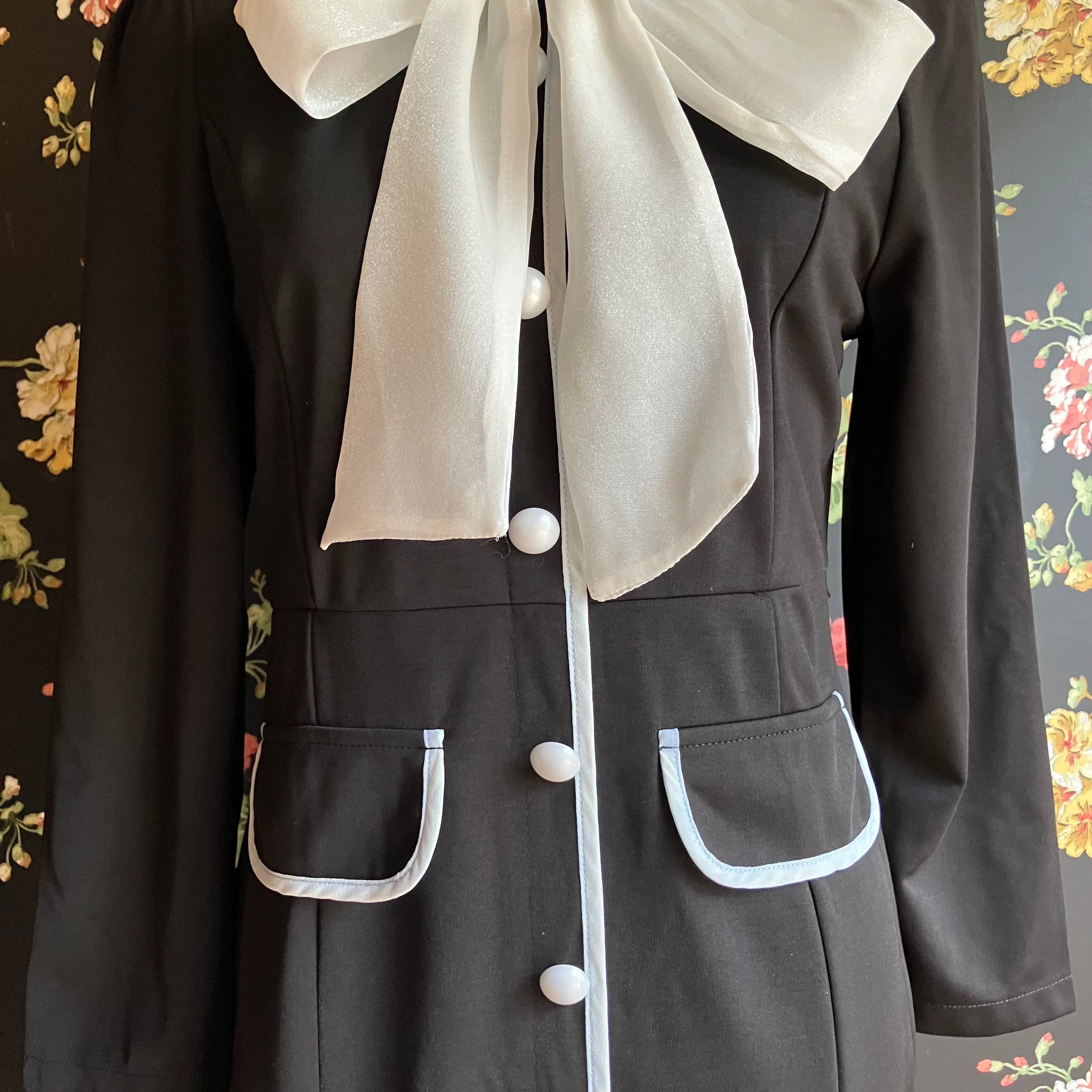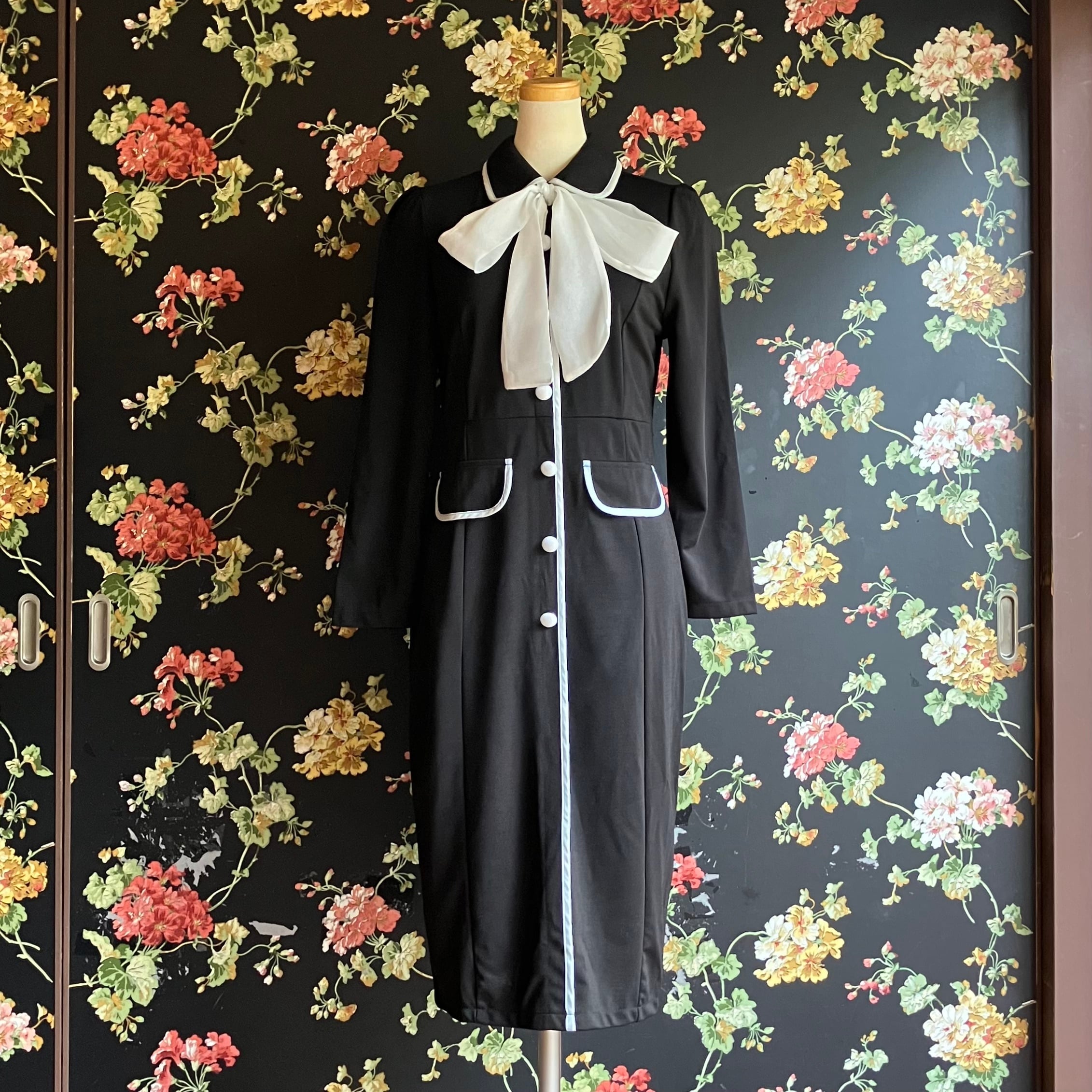 SALE 送料無料 ◆ D2053 ホワイトリボン付き ホワイトライン フラップ パールボタン 長袖 ロング ワンピース《ブラック×ホワイト》無地 クラシカル ブラック 黒系 ワンピース インポート パーティードレス メール便 パーティー お食事 ひざ丈 おしゃれ 袖あり インポートワンピース ロング フレア パーティードレス 膝下 膝丈 ミモレ 衣装 襟付き レースワンピース 光沢 ツヤ 切替 ワンピ エレガント 同窓会 謝恩会 発表会 無地ワンピース 上品