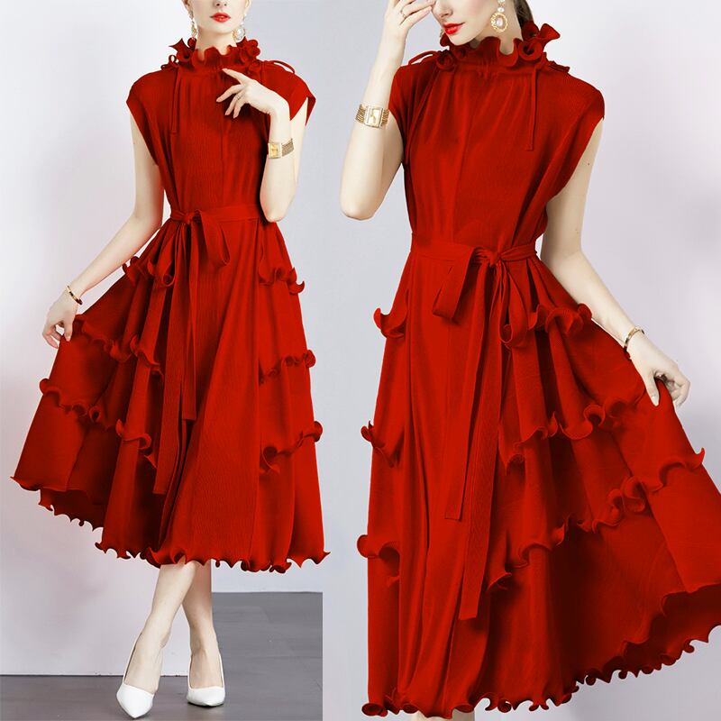 送料無料 ◆ D2068 リボン付き スタンドネック サイドリボン ラッフルフリル プリーツ ドレス ワンピース《レッド》赤 フレアワンピース プリーツ生地 無地 膝丈 ひざ下 インポートワンピース パーティードレス メール便 パーティーワンピ 袖付き お呼ばれワンピース ドレス 衣装 膝下 赤ドレス 赤ワンピ ドレス インポートワンピース お呼ばれ デート 上品 衣装 エレガント お出かけ クリスマス 発表会 同窓会 謝恩会