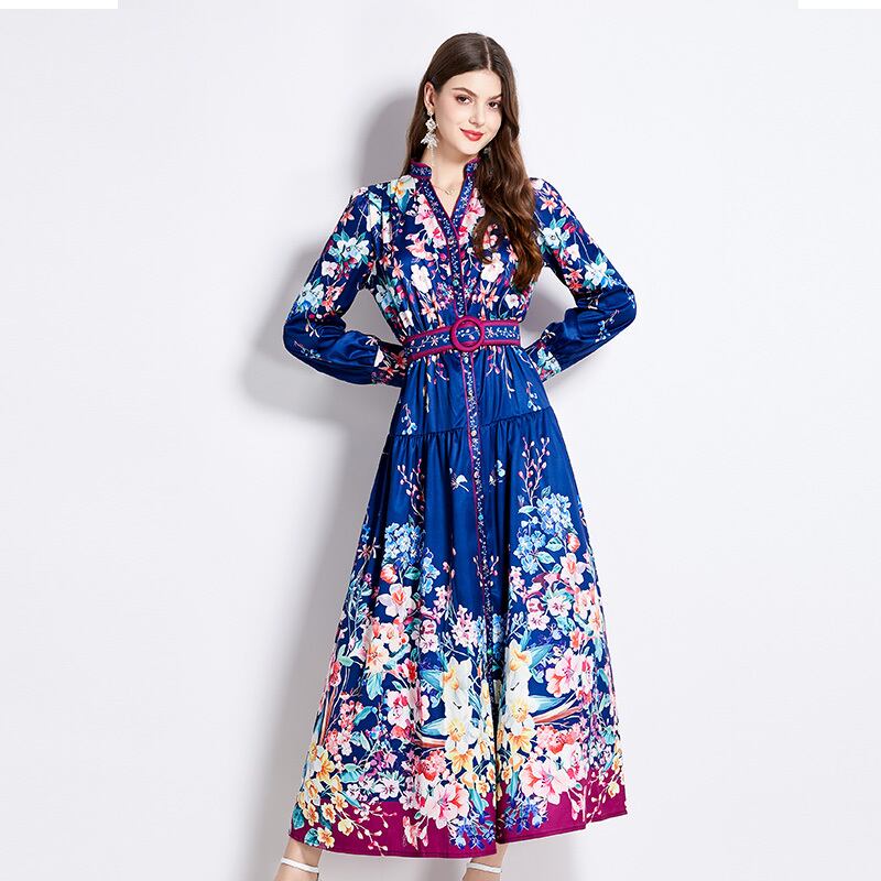 送料無料 ◆ D2070 ベルト付き パープルライン フラワー 前開き Vネック 長袖 ロング ワンピース《ネイビー×パープル 》カラフル 青 ネイビー マルチカラー 白 マキシ ベルト付き ウエストベルト ウエストゴム シャツワンピース 膝下 ミモレ フラワー インポート パーティードレス カジュアル 華やか 上品 メール便 パーティーワンピ お呼ばれワンピース お食事 マキシワンピース おしゃれ 上品 衣装 袖あり インポートワンピース フラワー