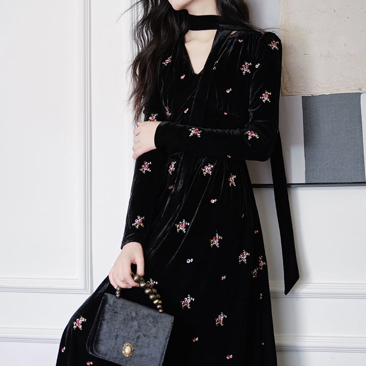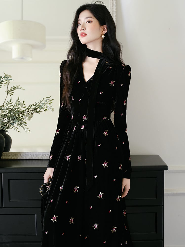 送料無料 ◆ D2099 ベロアリボン付き 刺繍 Vネック 胡桃ボタン ベロア ロング ドレス ワンピース《ブラック×ピンク》ポケット付き ベルベット パール 黒 ブラックドレス ベロアワンピ ベルベット ベロアワンピース ブラックドレス カフスボタン インポート パーティードレス メール便 黒ワンピース パーティーワンピ 結婚式 2次会 パーティー お呼ばれワンピース お食事 膝下 ミモレ ブラック 黒ドレス フォーマル 発表会 謝恩会 クリスマス 衣装
