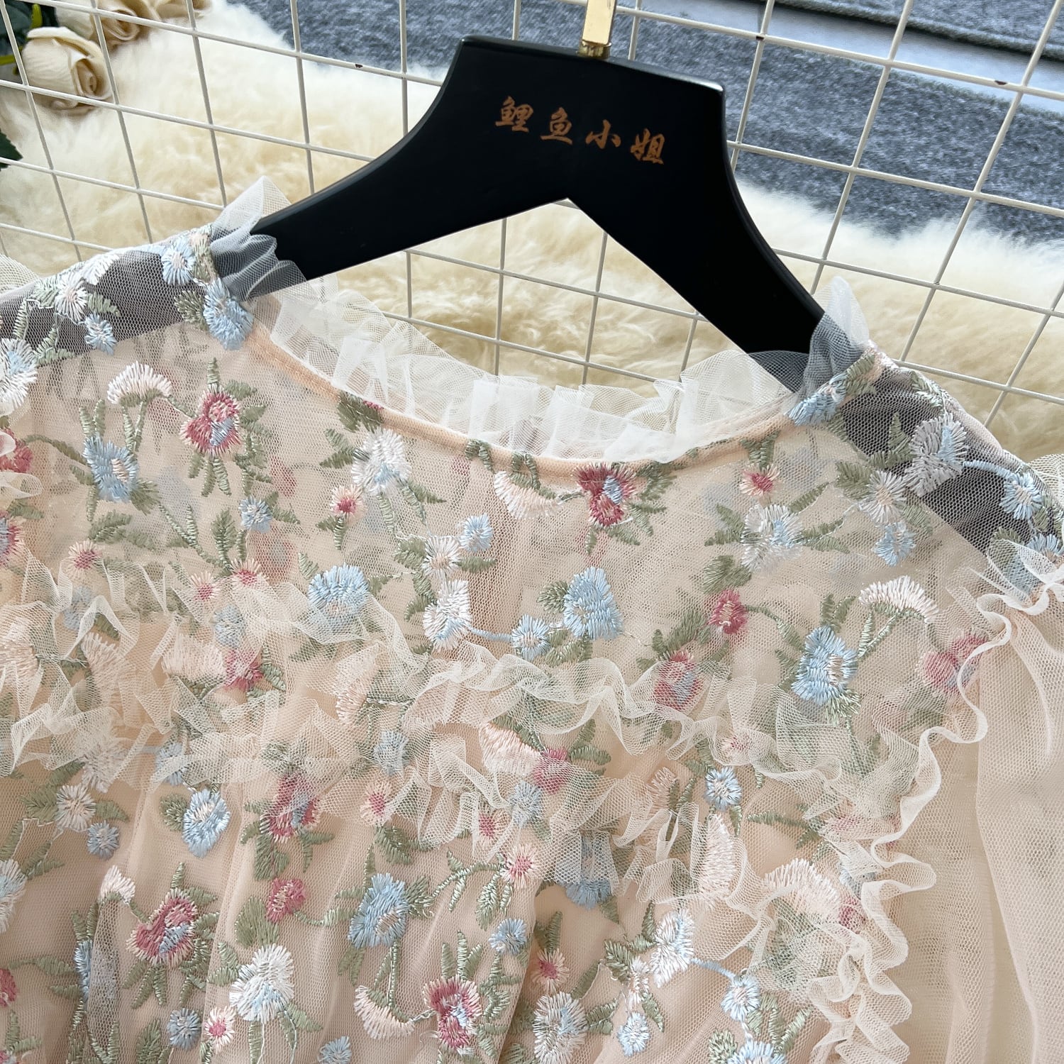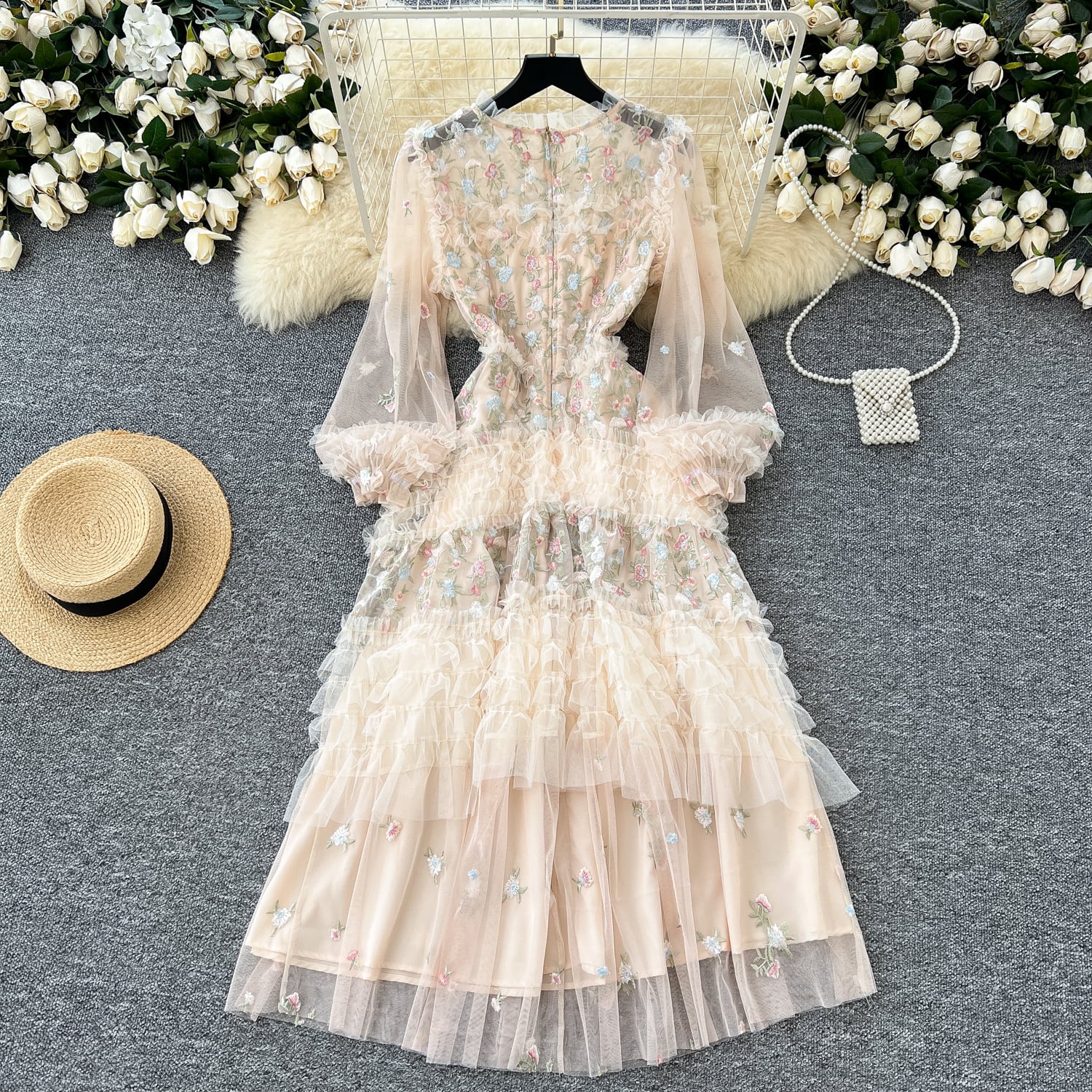 繊細な花刺繍が全体に施されています