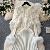 送料無料 ◆ D2103 2点セット フリル ニットケープ & ファーカフス Vネック ロング ニット ワンピース《ホワイト×ゴールド》ホワイトワンピース 白ワンピ ニットワンピ ワンピースセット 白ニット ファー ゴールド 膝下 インポート パーティードレス 上品 黒ワンピース パーティーワンピ お食事 コート インポートワンピース ホワイトドレス ケープ付き パーティー 発表会 衣装 同窓会 謝恩会 秋冬 卒業パーティー クリスマス