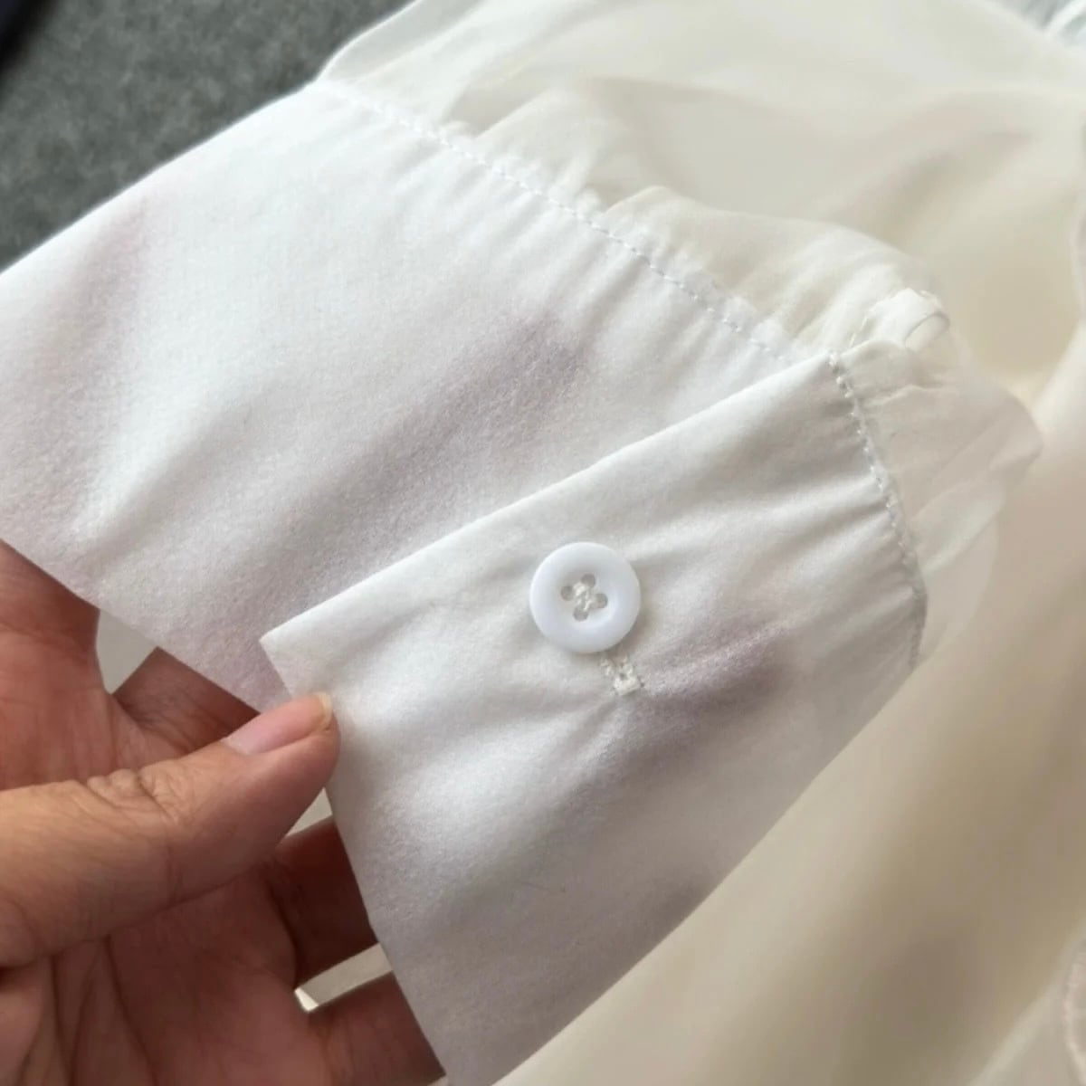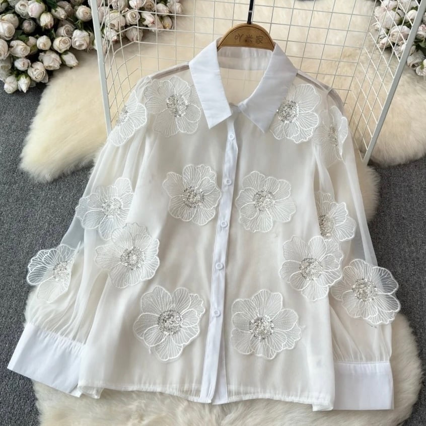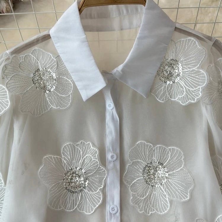 送料無料 ◆ D2110 ビーズ パール フラワー 立体 モチーフ 襟付き 長袖 前開き ドレスシャツ ブラウス《 ホワイト 》襟付き 白ブラウス 白 立体ブラウス シャツ 襟あり シャツ モチーフ付きブラウス 長袖 袖あり 無地 パワースリーブ ラッフル シャツ トップス 前開き 前ボタン フリル袖 インポート パーティードレス カジュアル メール便 カジュアル モード おしゃれ お出かけ お呼ばれ 衣装 シアーブラウス シアーシャツ クリスマス