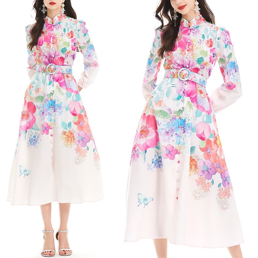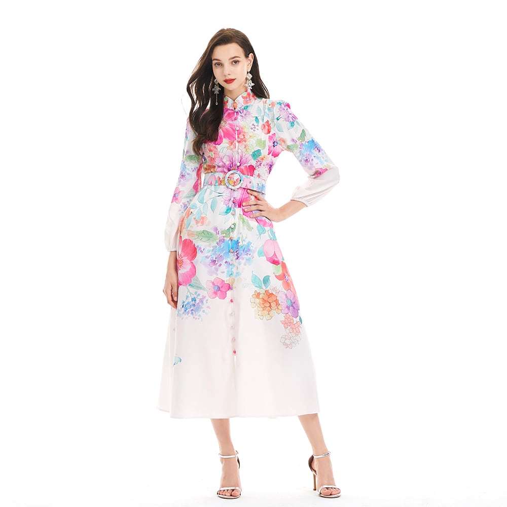 送料無料 ◆ D2129 ベルト付き 前開き 胡桃ボタン パステル フラワー バルーンスリーブ ロング ワンピース《 ホワイト×パステル》白 パステル 長袖 シャツワンピース 膝下 フラワー シャツワンピース インポート パーティードレス カジュアル 華やか 上品 メール便 パーティーワンピ お呼ばれワンピース お食事 ひざ丈 おしゃれ 上品 マルチカラー カラフル 衣装 袖あり インポートワンピース 華やか 発表会 同窓会 謝恩会