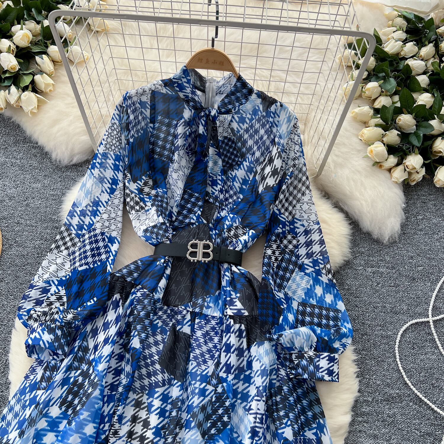 送料無料 ◆ D2139 ベルト付き ボウタイ パッチワーク柄 長袖 フレア ロング ワンピース《 ブルー 》 袖あり 長袖 花柄 千鳥格子 ホワイト 柄物 無地 インポートワンピース ワンピース パーティードレス メール便 パーティーワンピ 袖付き お呼ばれワンピース サテン ボウタイ ひざ丈 長袖 おしゃれ 透けない インポートワンピース お呼ばれ お出かけ 上品 結婚式 ロングワンピース
