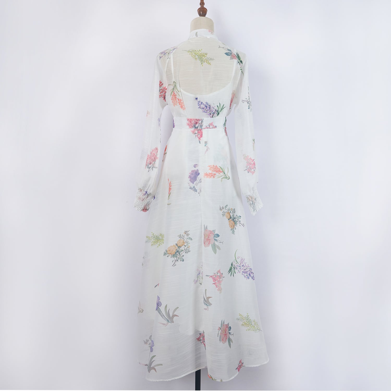 送料無料 ◆ D2145 3点セット キャミソール付き 花柄 ホワイトフラワー ボタン 長袖 ドレスシャツ ブラウス & ロングスカート セットアップ 《 ホワイト×パステル》カラフル フロアレングス パステル フラワー 上下セット 3点 コーデセット インポート パーティードレス カジュアル 花柄 メール便 上下セット パーティーワンピ お呼ばれワンピース お食事 おしゃれ 袖あり インポートワンピース シアー 花柄 清楚 エレガント 衣装 フロアレングス マキシスカート オケージョン