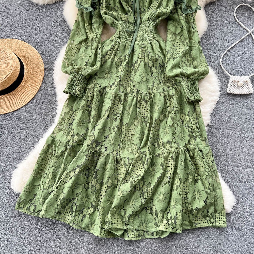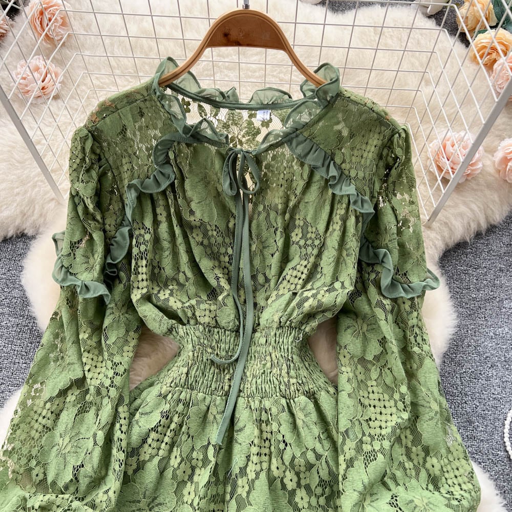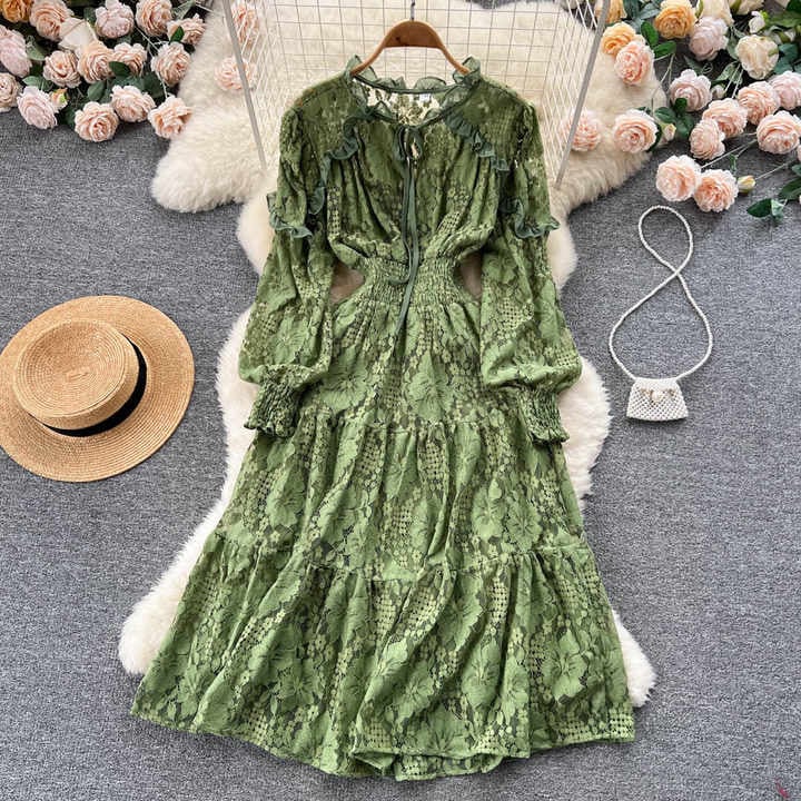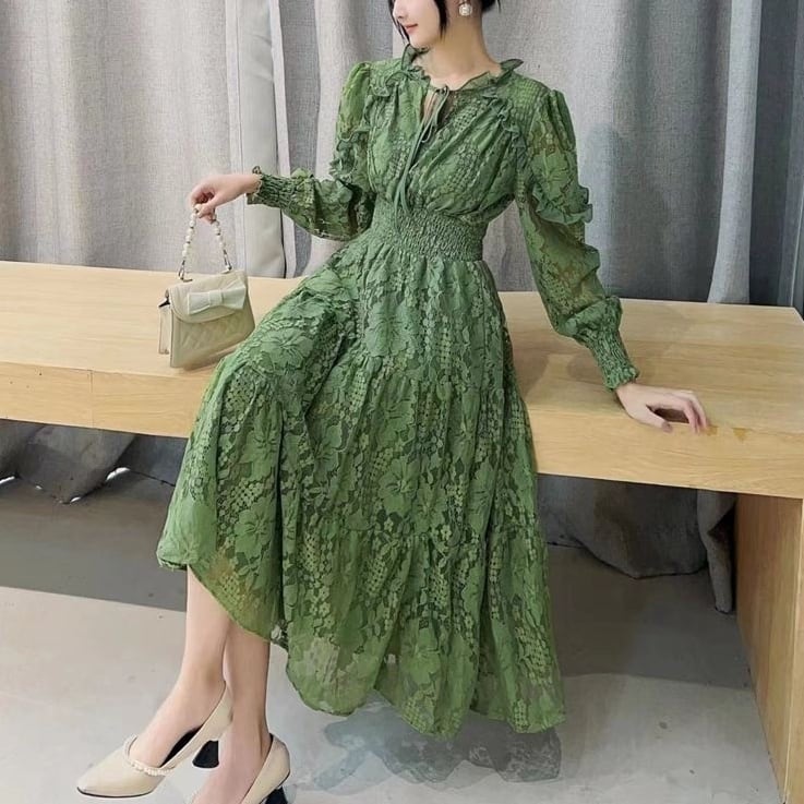 送料無料 ◆ D2148 レース フリル シャーリング ウエストゴム 長袖 ロング ワンピース 《 ライトグリーン》クラシックドレス 黄緑 ピスタチオグリーン フラワーレース 膝丈 インポートワンピース メール便 裏地あり 上品 エレガント レトロ 結婚式 お呼ばれドレス ロングワンピース ライトベージュ パーティー ワンピ インポートドレス 黄緑 発表会 謝恩会 同窓会 卒業パーティー