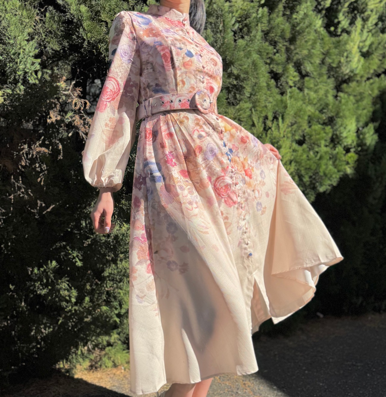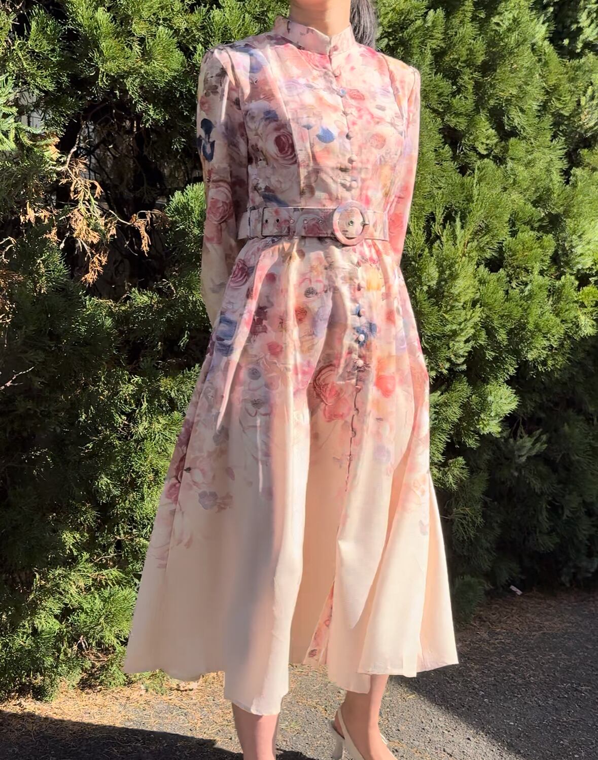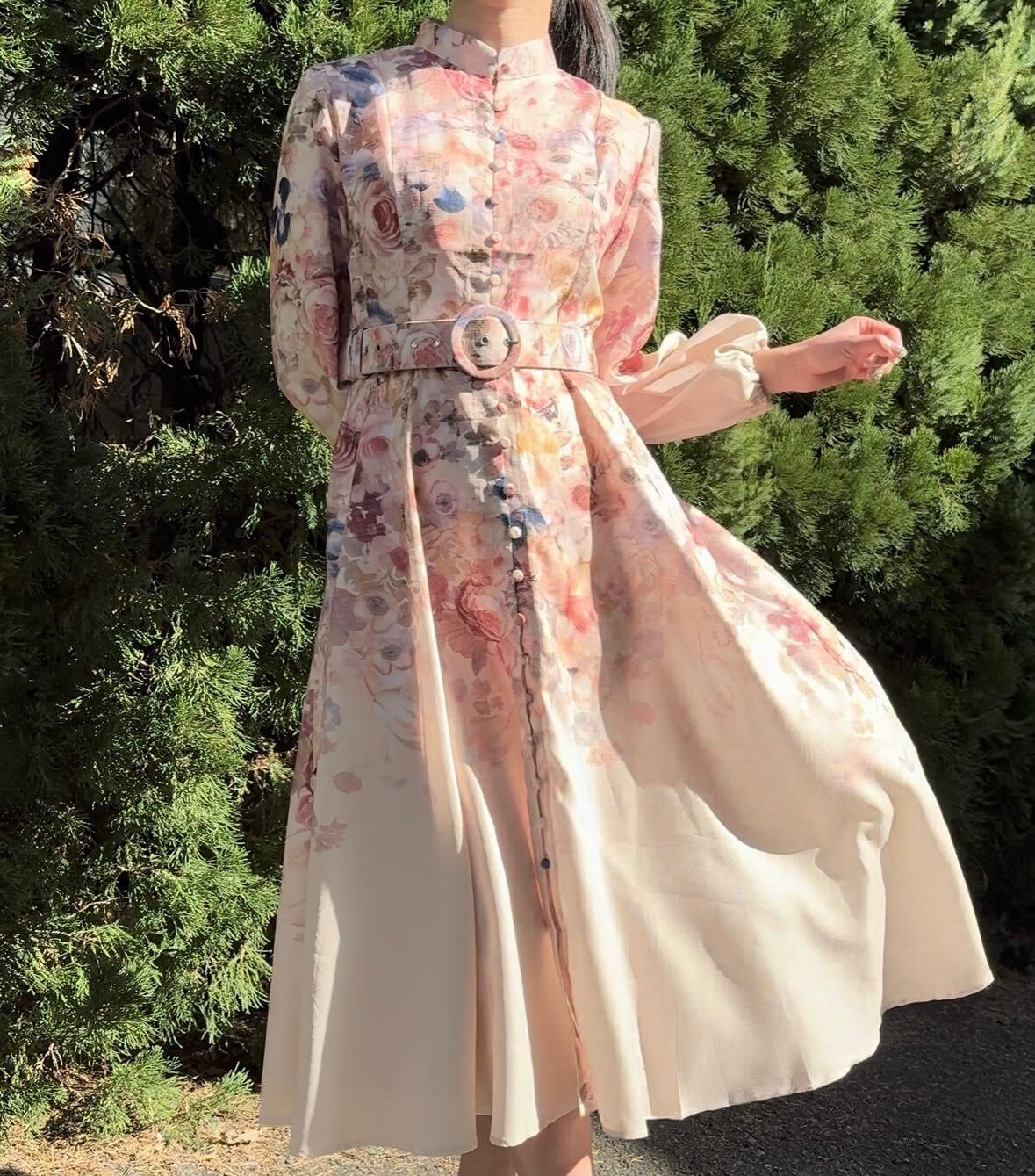 送料無料 ◆ D2164 ベルト付き 胡桃ボタン 花柄 バルーンスリーブ ロング ワンピース《 ライトベージュ 》 フラワー 花柄 クラシック ロングスリーブ ワンピース マキシ丈 お出かけ 清楚 上品 インポートワンピース パーティードレス 衣装 柄ワンピース 柄物 パーティー 華やか エレガント メール便 マキシ エレガント 上品 清楚 衣装 英字 文字 襟付きワンピ シャツワンピ