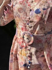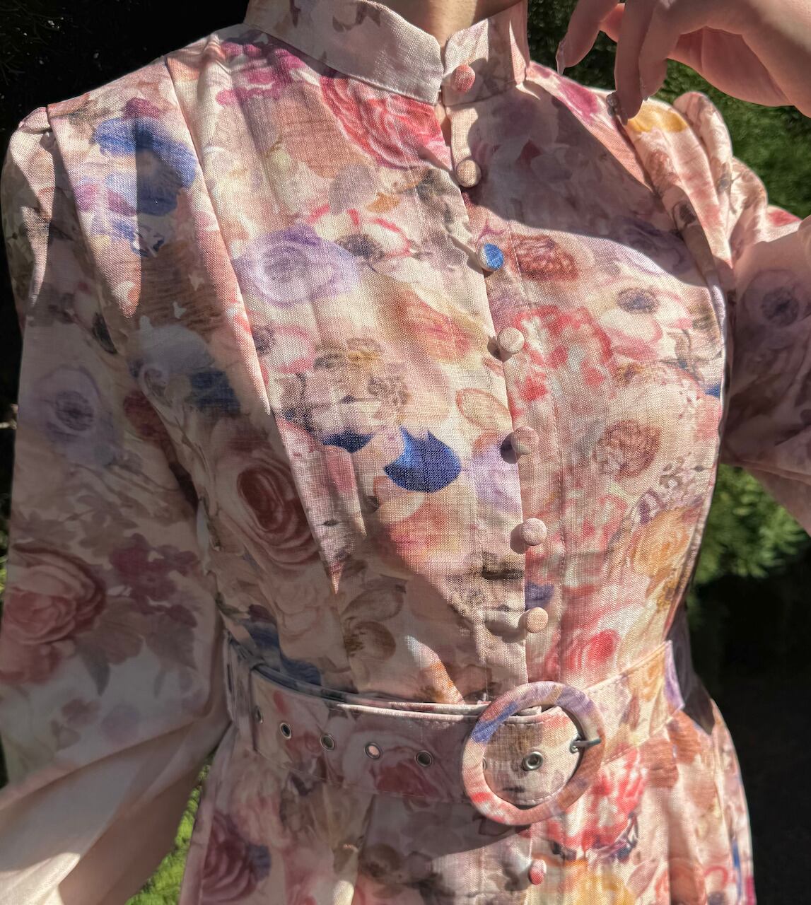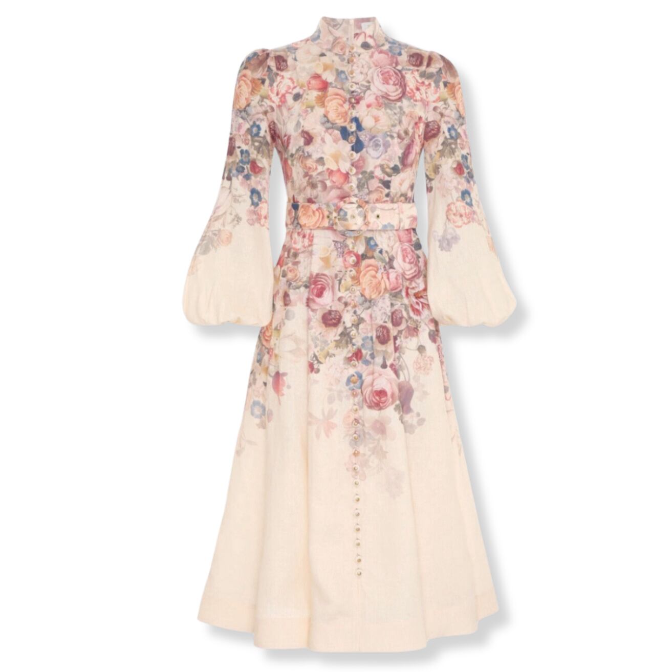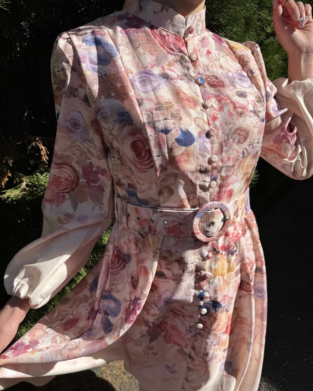 送料無料 ◆ D2164 ベルト付き 胡桃ボタン 花柄 バルーンスリーブ ロング ワンピース《 ライトベージュ 》 フラワー 花柄 クラシック ロングスリーブ ワンピース マキシ丈 お出かけ 清楚 上品 インポートワンピース パーティードレス 衣装 柄ワンピース 柄物 パーティー 華やか エレガント メール便 マキシ エレガント 上品 清楚 衣装 英字 文字 襟付きワンピ シャツワンピ