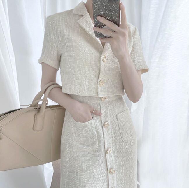 《訳ありアウトレット》送料無料 ◆ D558 ゴールドボタン 開襟 半袖 ジャケット & スカートツイード セットアップ スーツ《 ホワイト》 スカート タイトスカート セット 半袖 無地 黄緑 ライトグリーン 白セットアップ ミモレ 膝下 アンクル丈 タイト クラシカル パーティードレス 袖付き お食事 ひざ丈 無地 袖あり オフィスカジュアル お呼ばれ お出かけ上品 インポートセットアップ 訳あり ワケあり 訳あり品
